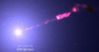 التقط تلسكوب جيمس ويب الفضائي (JWST) أوضح صورة بالأشعة تحت الحمراء على الإطلاق لنفاثة الثقب الأسود من قلب المجرة العملاقة M87، كاشفًا عن تفاصيل جديدة حول التدفق الناتج عن الثقب الأسود، وفي الصورة الجديدة التي التقطها تلسكوب جيمس ويب الفضائي، يظهر التدفق كشريط وردي مضيء ينكشف على خلفية بنفسجية ضبابية، وينطلق تيار الجسيمات المشحونة على بُعد بضعة آلاف من السنين الضوئية من الثقب الأسود المركزي لمجرة M87.