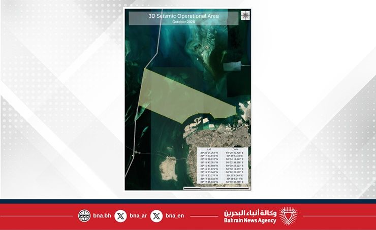 المنامة في 30 سبتمبر/ بنا / أعلنت وزارة الداخلية أن قيادة خفر السواحل أشارت إلى أن منطقة أعمال المسح البحري ثلاثي الأبعاد، التي تنفذها شركة بابكو إنرجيز ضمن نطاق المياه الإقليمية لمملكة البحرين، قد تم تغييرها اعتباراً من يوم الأربعاء الموافق 1 أكتوبر 2025 وحتى 1 ديسمبر 2025 (حسب الخارطة المرفقة) ضمن الجدول الزمني المعتمد للمشروع.